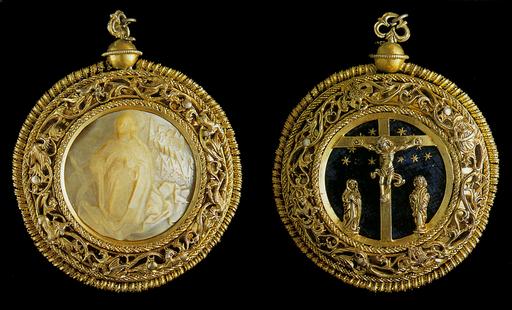 Monile okrugla oblika iz dva dijela. Rubovi su ispunjeni vegetabilno-zoomorfnim motivima. S jedne je strane na podlozi plavog emajla prikaz 'Raspeća' s likovima Marije i Ivana uz križ, a na drugoj reljef u sedefu s prikazom sv. Katarine Sijenske koja kleči.