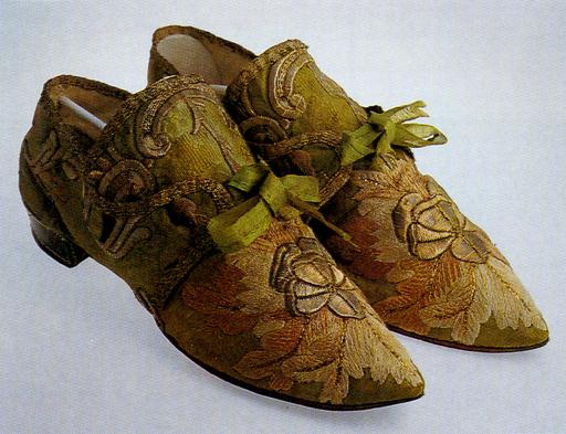 A pair of low laced silk slippers. On the inside lined with fur. Decorated with symmetrically placed embroidery with a larger flower in the middle. Edged with gilt decorative ribbon. The green silk laces have been preserved.