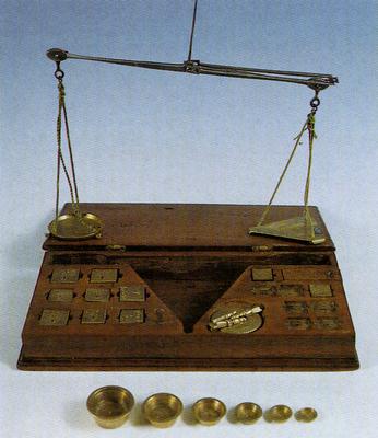 The wooden box with a lid holds 10 weights (six of them are missing) for measuring the weight of European gold and silver coins, a set of weights for inlaying and a straight-beam balance. The weights were taken from the Cologne goldsmiths' system. In a recess of the box small weights and beads used as makeweights are situated. These weights belong to the decimal measuring system and are not a part of this set. Eight brass weights shaped as a truncated cone, of different shapes, weights and markings were used for weighing silver coins.