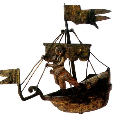 Mali brodić s jarbolom, jedrom i zastavicom te s mornarom koji diže jedro. Djelomično obojen (boja je slabo sačuvana). Vrlo jednostavne i primitivne izrade.