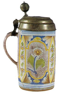 A tankard (so-called Masskrug - jug for a single measure of beer) with a lid, painted in multicoloured flower and stylised geometric ornaments. The tankard has a cylindrical shape with a ball-shaped thumbpiece on a tin lid and a figure of the Mother of God with Child and an illegible inscription. The bottom of the tankard was encased with tin (the encasing is missing).