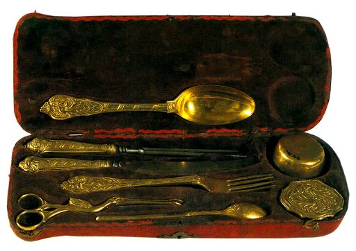 The set consists of 8 pieces: two forks with two and four points, a large spoon, a small spoon, sugar tongs shaped like a stork, a small box with a lid for salt and paprika, and a small cup. It is richly ornamented with Baroque relief decorations. The set is stored in a box with a lid covered with red leather with the initials IG done in gold-print. The box is inlaid with violet velvet indented for the various items.