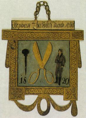 The sign has a rectangular shape, in a classicist frame with chain for hanging on the top and a garland with a wreath on the bottom. Painted on one side with a nail grip, scissors, male figure in town clothes and the year 1820. Above the frame an inscription: Steph. Zbukvich Burg. Kleid. Macher. The same scene on the other side, the only difference being that the male is dressed in Hungarian dress, and the inscription is as follows: Stephan Zbukvich Mach. sabo.