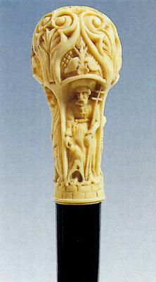 Okrugao, od crne ebanovine sa srebrnim okovom na vrhu štapa. Na dršku od slonove kosti rezbareni likovi četvorice evanđelista u nišama, nadvišeni biljnim ornamentima.