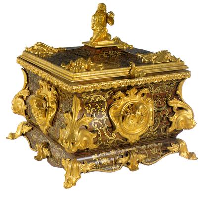 Square-shaped, standing on eight feet profiled as leaves with brass studs shaped as floral motifs and lions' heads with leaf-shaped endings. The whole surface is richly incrusted with brass ornaments of leaves and tendrils. At the sides appliques of brass cartouches with double eagles and figures of smoking men and women. The lid holds a figure of a reclining smoker. Inside two horizontal bars with openings for 49 cigars.