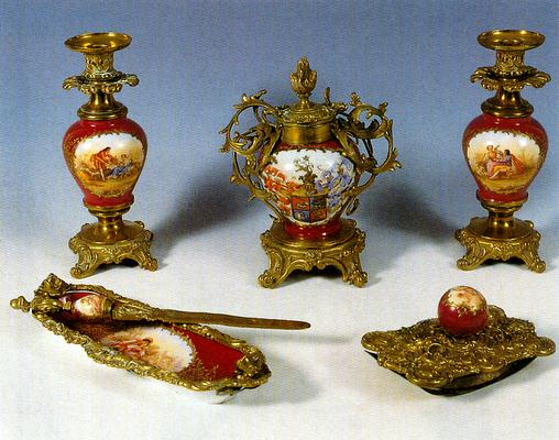 Consisting of five parts; two candlesticks, inkstand, paper knife and a plate for writing utensils. Made of finely coloured porcelain with cartouches painted with pastoral scenes, and studded with gilt brass with relief decorations of rocaille, volute and floral motifs. The inkstand has a painted coat of arms of the Miletic family.