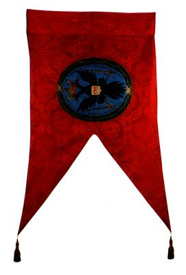 Double edged cavalry flag with red and blue tassels at the ends. Both sides of the flag field are decorated with painted heraldic emblems. Obverse: in a red medallion edged with laurel wreath Hungarian (?) coat of arms with the motto In hoc signo vinces (Under this sign you will win). Reverse: in a blue medallion edged with a laurel wreath a crowned double-headed eagle, bearing a white shield with the initials of the ruler Charles VI (C VI) on his breast. In his talons he holds the ruler's insignias, a sceptre and a sword. Around the laurel wreath the inscription reads: Deo Carolo VI patriae vexilum fidele inclitae nobilitatis comitatus Crisiensis (To the divine Charles VI the flag of the homeland, the nobility of Krizevci County known for their fidelity). The flagstaff is spirally painted in red and white, and ends in a brass foliate finial with the pierced initials CC (Comitatus Crisiensis).