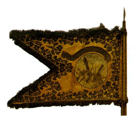 Double-edged cavalry standard richly embroidered and edged with fringes. Obverse: in the centre of the field, richly decorated with floral motifs, is the embroidered Austrian dynastic coat of arms. Reverse: the field holds an embroidered medallion in the Baroque manner, depicting a set of Roman military trophies. The flagstaff, fluted like a tournament lance, ends in a finial, which has on one side the incised coat of arms of the Prince of Sachsen Hildburgshausen, and on the other the figure of St John Nepomucene.