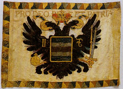 Jednostavna zastavna vrpca ukrašena jednostavnom srebrnom bordurom uz rub trake i vezenim natpisom uz krajeve vrpce obrubljenim stiliziranim grančićama. Natpisi na krajevima: MARIA.THERESIA / AVG / VEXILUM.HOC.ET / FASCIAM.ADNEXAM / ACV.PHRYGIA.A.SE / PICTAM. i PROVINCIAE.POSE / GANAE.MILIT.VE / NATORIBVS BENIG / NITATIS.SVAE.DO / CVMENTVM.DONAT / MDCCCI.
