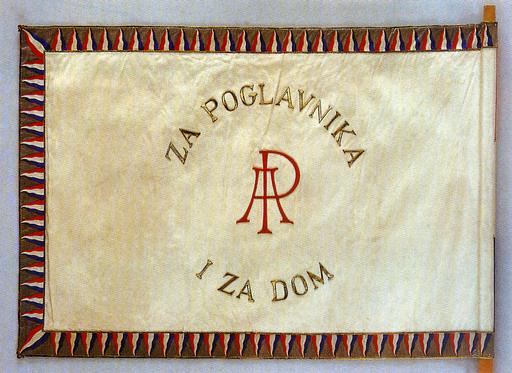 Rectangular flag, the obverse in the colours of the Croatian tricolour, the reverse in golden-white silk. Obverse: a Croatian tricolour edged with a silver border with small red, white and blue triangular flames. The centre of the field holds the state coat of arms. Above the coat of arms, in the red field, the inscription reads: STO BOG DA, while the inscription in the blue field reads: I SRECA JUNACKA. The top corner near the staff holds the number of the regiment: 369. Reverse: the centre of the field holds the monogram AP (Ante Pavelic) embroidered in dark red. The embroidered inscription around the monogram reads: ZA POGLAVNIKA I ZA DOM. The flagstaff is simple, and the finial has not been preserved.