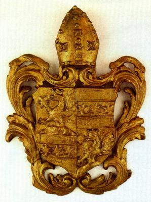 Kvadriran: 1. i 4. iz trobrijega raste okrunjeni grif sa šestokrakom zvijezdom u desnoj šapi, 2. i 3. na gredi 3 šestokrake zvijezde. Iznad štita biskupska mitra; plaštevi vitičasto rezbareni.