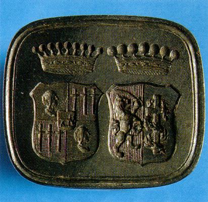 Četvrtast, sa zaobljenim uglovima; u pečatnom polju, jedan do drugoga, dva grba: desno grb obitelji Ožegović (štit raskoljen srebrno i crveno: desno maslinova grančica ovijena oko križa, lijevo uspravljen dvorepi lav u uzdignutoj desnoj šapi drži sablju, a u lijevoj lovorov vijenac; iznad štita barunska kruna), lijevo grb obitelji Sermage (štit kvadriran crveno i plavo, sa srcem štita u sredini: na zelenom tlu pase jelen; 1. i 4. tri bodeža u nizu vrhovima okrenuta prema dolje, 2. i 3. djevojačko poprsje; iznad štita grofovska kruna). Donji dio drška načinjen je od nikla i ukrašen profilacijama, a gornji od mramora boje višnje, u obliku osmerostrane, obrnuto postavljene, krnje piramide, zaobljena vrha.