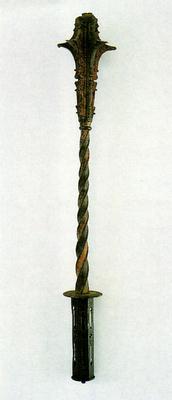 Gothic club-rush made of iron with six elongated points widened into beaks. The lower parts of the points are thinner and richly profiled. The head, in the shape of a flat cap, ends in a four-petal flower. The handle is twisted with rough edges. A round plaque placed on the handle is decorated with elongated and four-leaf perforations. At the bottom of the handle a small loop through which a belt was drawn. Traces of green and yellow paint are visible on the handle and club-rush.