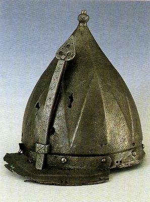 Turkish pointed helmet made of iron, decorated with elongated triangles at the bottom, ending in a ribbed turban. Chin guard in front and a vertical nose guard, which widens in the upper part with three rounded perforations. At the mount of the guard a small square protruding profile with the mark of a tilted cross with dots.