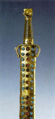 Wooden handle coated with brass. Handle button shaped as a 'cat's head' with protruding central section. Crosspiece with deeply curved ends. The blade is wider, double-edged, with four shorter fullers. A wolf symbol situated on the reverse part of the blade. The scabbard is wooden, reinforced with metal, with beds for 75 stones in various colours.