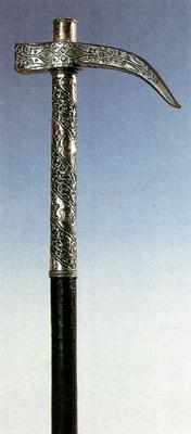 Four-sided iron head with a slightly curved tip, inlaid with silver wire. The ornaments are done in the 'rumi' style. The hilt is wooden, the upper part of it sheathed with ornamented silver reinforcements. Leather sheath in the middle. The reinforcements in the upper part of the hilt are missing.