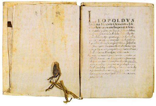 Manuscript book, bound: green velvet with green silk ribbons and a hanging small seal of Charles VI in wax, in a wooden box without a lid. The illuminated parchment leaf shows the scene of eleven men swearing allegiance to Charles VI. Above the throne is the Austrian coat of arms form the time of Charles VI, and to the left and right are three coats of arms on each side. They include the coats of arms of the Kingdom of Croatia and the Kingdom of Dalmatia.