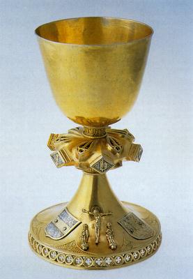 Kasnogotički kalež s okruglim podnožjem na kojem su aplicirani prikazi 'Raspeća', te sa svake strane po jedan grb (austrijski i neidentificirani grb grada). Na rombičastim je istacima nodusa natpis goticom 'ihesus', a na prstenovima je njemačkim tekstom ugravirano 'Maria hilf uns' (ispod) i 'Maria Mater Christi' (iznad) nodusa.