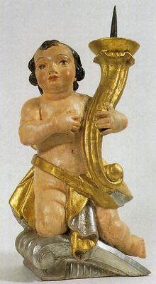 Mali anđeo kleči na voluti i drži nosač svijećnjaka u obliku roga obilja. Oko bokova draperija, desna ruka na prsima.
