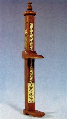Sprava za mjerenje dužine stopala. Sastoji se od osnovnog čvrstog dijela, pomičnog dijela sa skalom od slonove kosti i pomičnog gornjeg dijela 'cipele' kojim se mjeri dužina stopala. Skala je obilježena brojevima od 1 do 20.