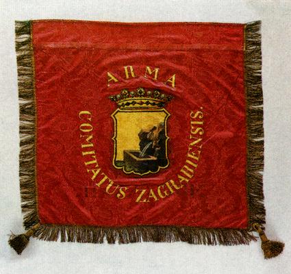 Zastava pačetvorinasta oblika, obrubljena resama. S obje strane zastavnog polja ukrašena likovnim prikazima, okomitima na koplje. Avers: okrunjeni središnji dio grba Zagrebačke Županije koji je dodijelila Marija Terezija 16.7.1759.g. Uokolo grba natpis zlatnim slovima slikarskom bojom: ARMA COMITATUS ZAGRABIENSIS ('grb Zagrebačke Županije'). Revers: u sredini zastavnog lista ikonografski prikaz sv. Jurja koji ubija zmaja i godina: MDCCCXII (1832.) ispod prikaza.