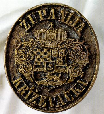 Ovalan; u sredini pečatnog polja grb Trojedne Kraljevine Hrvatske, Dalmacije i Slavonije (štit razdijeljen, gore raskoljen - desno šahiran bijelo-crveno 5x5, lijevo tri okrunjene leopardove glave 2:1; dolje kuna u trku između dvije valovite grede), s umetnutim srcem štita u sredini u kojem se nalazi ilirski grb (ispod zvijezde mladi mjesec vrhovima okrenutim prema gore); iznad štita kruna, sa svake strane vitičasti plaštevi, a uokolo natpis: ŽUPANIJA KRIŽEVAČKA.