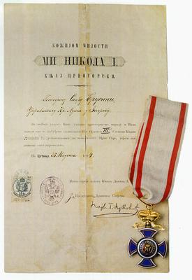 Diploma is written on a folded piece of paper, and the text, in Cyrillic, is placed only on the right-hand side of the page: BOZIJOM MILOSTI / MI NIKOLA I / KNJAZ CRNOGORSKI. Gospodinu Spiru Brusini, Upravitelju Kr. Muzea u Zagrebu. Za osobite usluge Vase ukazane crnogorskom narodu i Nama nasli smo se pobudeni odlikovati Vas Ordenom III-eg Stepena Knjaza Danila I, ustanovljenim za nezavisnost Crne Gore, kojega vam znakove ovim sprovodimo. Na Cetinju, 25. Avgusta 1894. Kancelarija ordena Knjaza Danila I. Za Predsjednika Drzavnog Savjeta: (signature) Vojv. G. Vukovic. (BY THE GRACE OF GOD/ WE, NICHOLAS I/ PRINCE OF MONTENEGRO/ to Mister Spiro Brusina, Director of the Royal Museum in Zagreb. For special merit shown to the people of Montenegro and to Us, we have felt obliged to award you with the Order of Danilo I, 3rd rank, instituted to mark Montenegro's independence, the emblems of which are hereby granted. In Cetinje on August 25th 1894. Office of the Order of Prince Danilo I. On behalf of the President of the State Council: (signature) Vojv. G. Vukovic.)