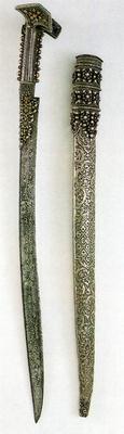 The hilt is coated in silver with larger faceted ears. The ears are decorated with filigree and hold two corals on either side. At the joint a filigree decoration and eleven corals. On the extension of the grip a grain ornament, and on the leaf-shaped part of the blade filigree decoration with a coral grain on each side. The blade is steel, single-edged, curved and has a narrow fuller along the blunt edge. Along the entire length of the blade is on one side decorated with ornaments, while on the other it has an inscription in Arabian that reads: 'Made in 1218 by Haji Nuh for the owner Ibrahim-aga. O heart, do not, for the sake of one soul, give offence to everyone. Do not blame the Sultan that he takes pleasure in this world.'