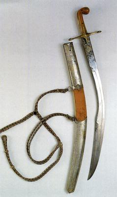 Turska sablja. Držak od smeđe rožine s povijenom lukovičastom glavicom. Križnica od srebra s ravno pruženim, profiliranim završecima i tankim dvokrakim jezikom po sredini. Sječivo jednobrido, zakrivljeno s naglašenim jalmanom (dvobridnim vrškom). Na sječivu s obje strane reljefni ukrasi arabeski i kartuša u pozlati s arapskim natpisima koji u prijevodu glase: 'Oslonio sam se na Alaha.' // 'Nema junaka do Alije, ni sablje do Zulfikara.'