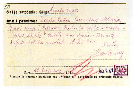 An inmate of a women's concentration camp writes to her brother Branko in Zagreb. The postcard was 'officialy examined' (stamped) by the camp authorities and 'writing the postcard was a prize to be gained by good work and behaviour, as well as giving inmates the right to receive packages' (text from the postcard).