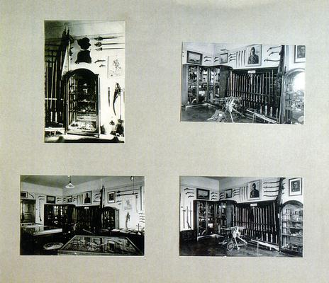 The photographs include museum items, persons from the state leadership who were present at the opening of the Museum, and Museum rooms at Jesuit Square. The photographs show that the Museum was full of museum items; weapons were placed in showcases and on walls, and pictures, prints and drawings were placed above the wooden showcases. The Museum items did not have appropriate captions.