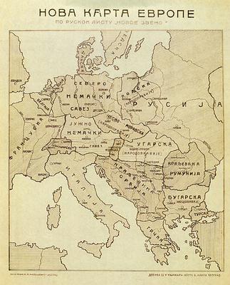 Map of Europe after the end of the First World War and the disintegration of the Austro-Hungarian Monarchy, as seen in Moscow and accepted in Belgrade.
